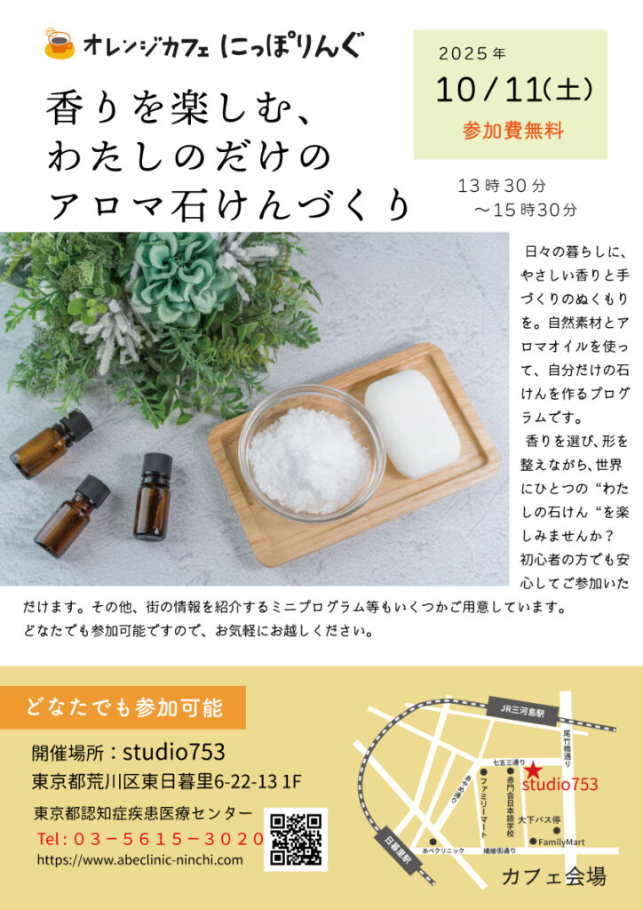 10月のオレンジカフェでは、「香りを楽しむ、わたしだけのアロマ石けんづくり」と題して、アロマ石けん作りを行います。